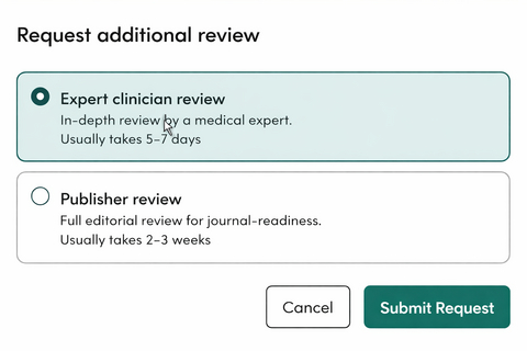 The review process includes four key steps to leverage both the latest technology and keep the clinician review in the loop to maximize quality and accuracy. Every LLM summary of literature, guidelines, and novel evidence from Alexandria, the Atropos Evidence Library, includes an “Answered with Evidence” evaluation that clearly identifies the quality of the evidence presented for the questions asked. Every piece of novel evidence included in an answer will contain an AI Peer Review report that evaluates the method and design, and grounds comparison of the novel evidence in existing literature in the voice of a journal peer reviewer. For every answer, a user can request an Expert Clinical Review of the evidence presented. Lastly, a user can request an independent review from an international publisher, which, if meeting publishing standards, can lead to a published manuscript, allowing users to rapidly publish their findings and advance research objectives. The process was collaboratively developed by published authors, MDs, PhDs, and industry experts. All content in the Alexandria library is reviewed by AI and receives a pass, pass with notes, or pass with limitations ranking.